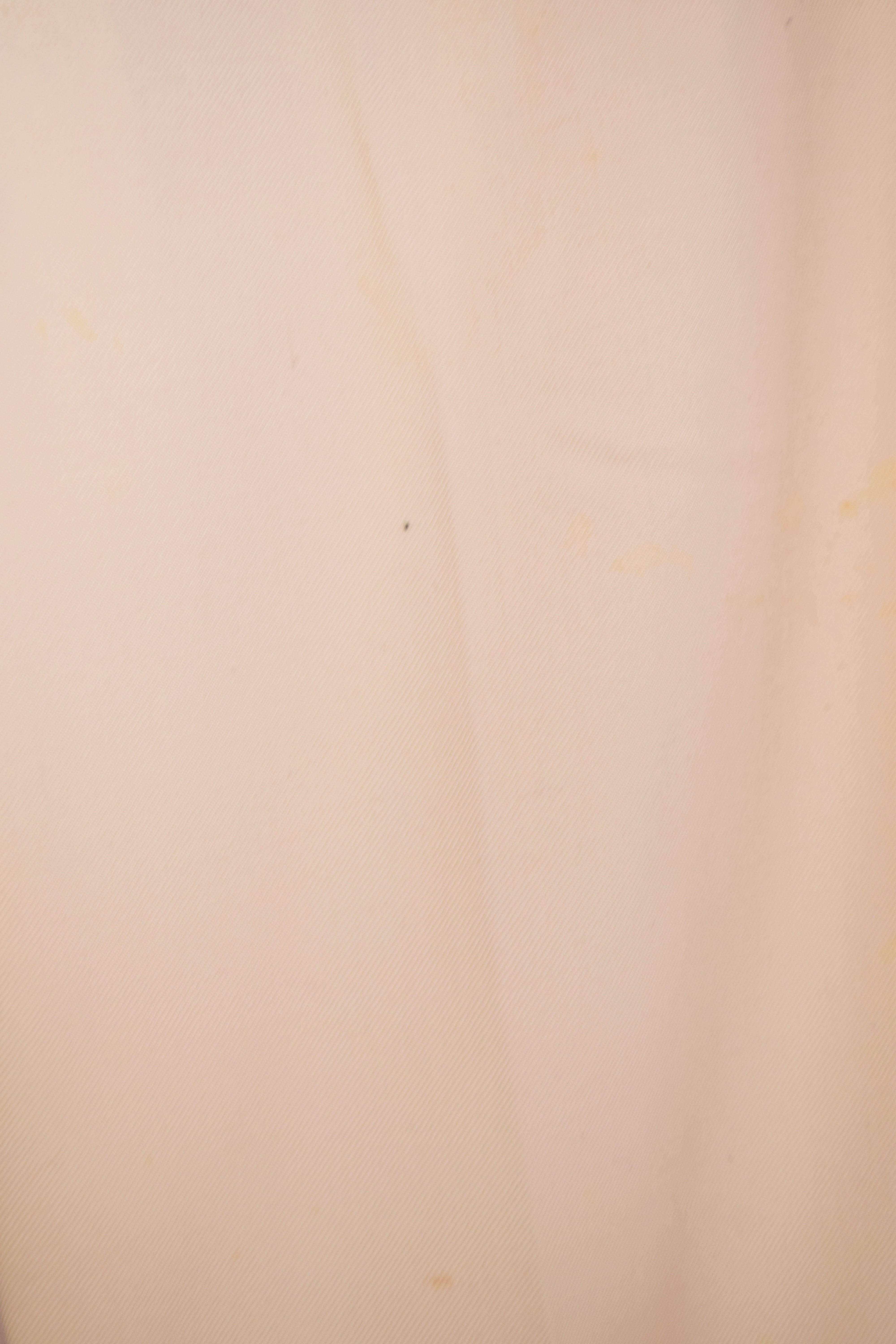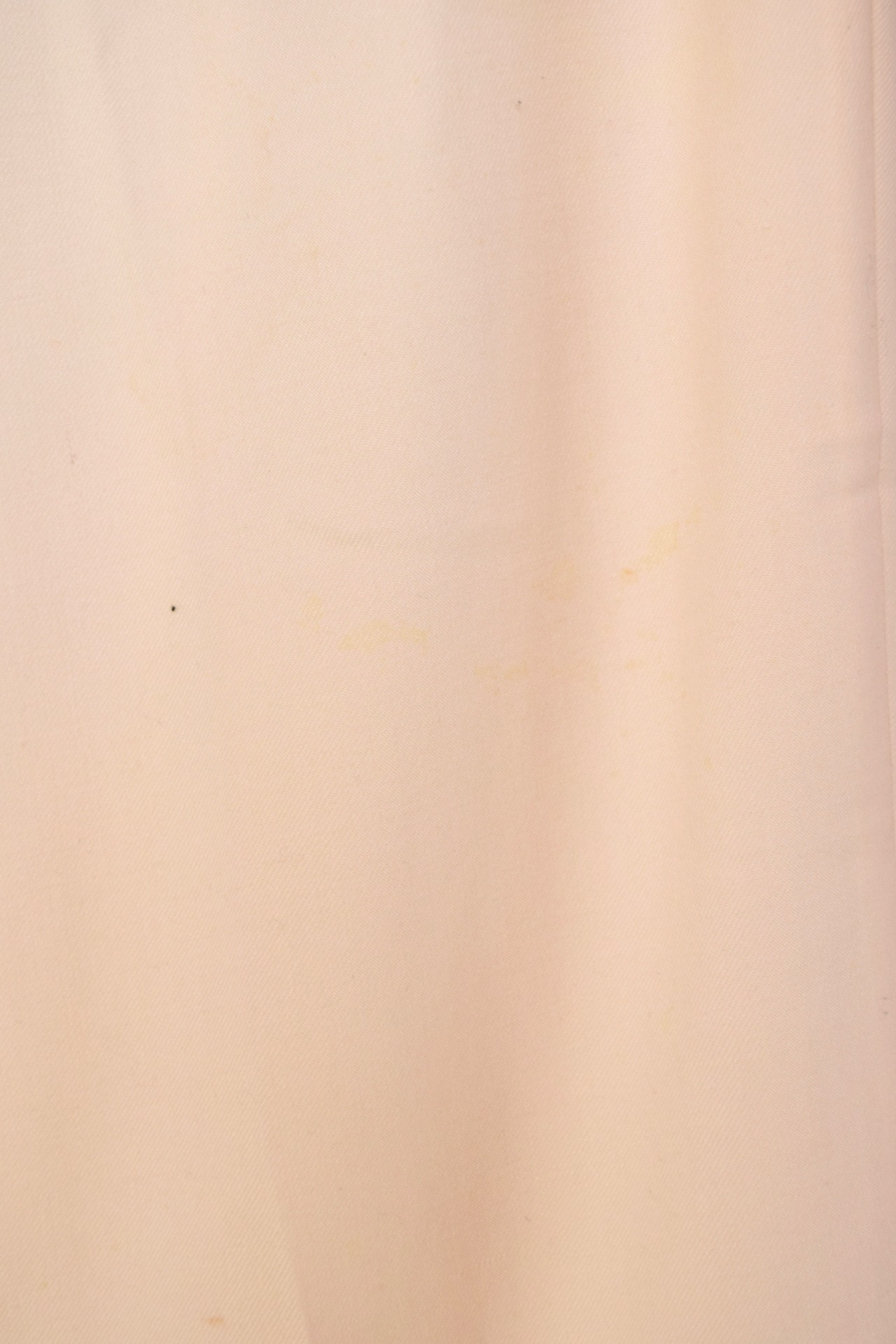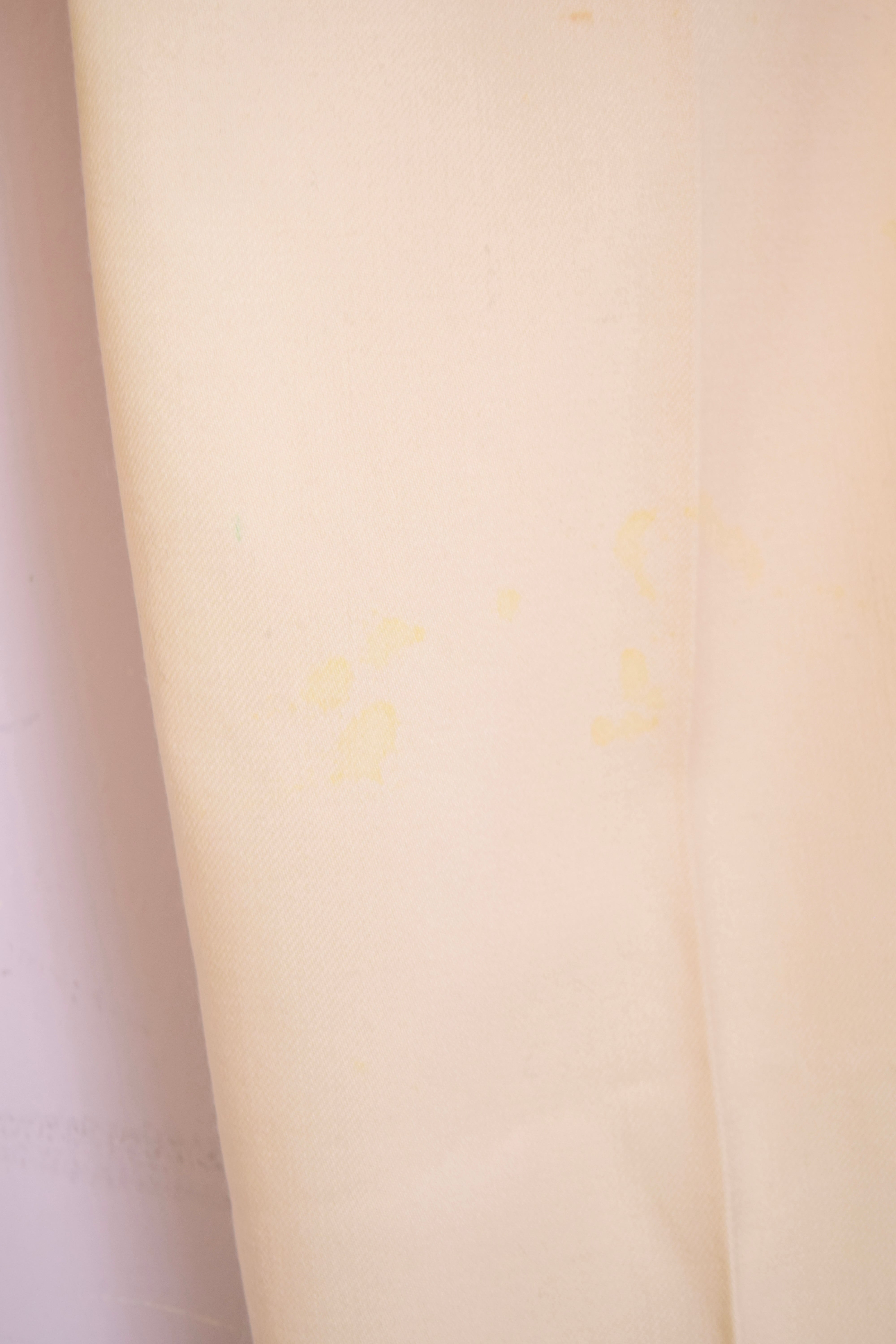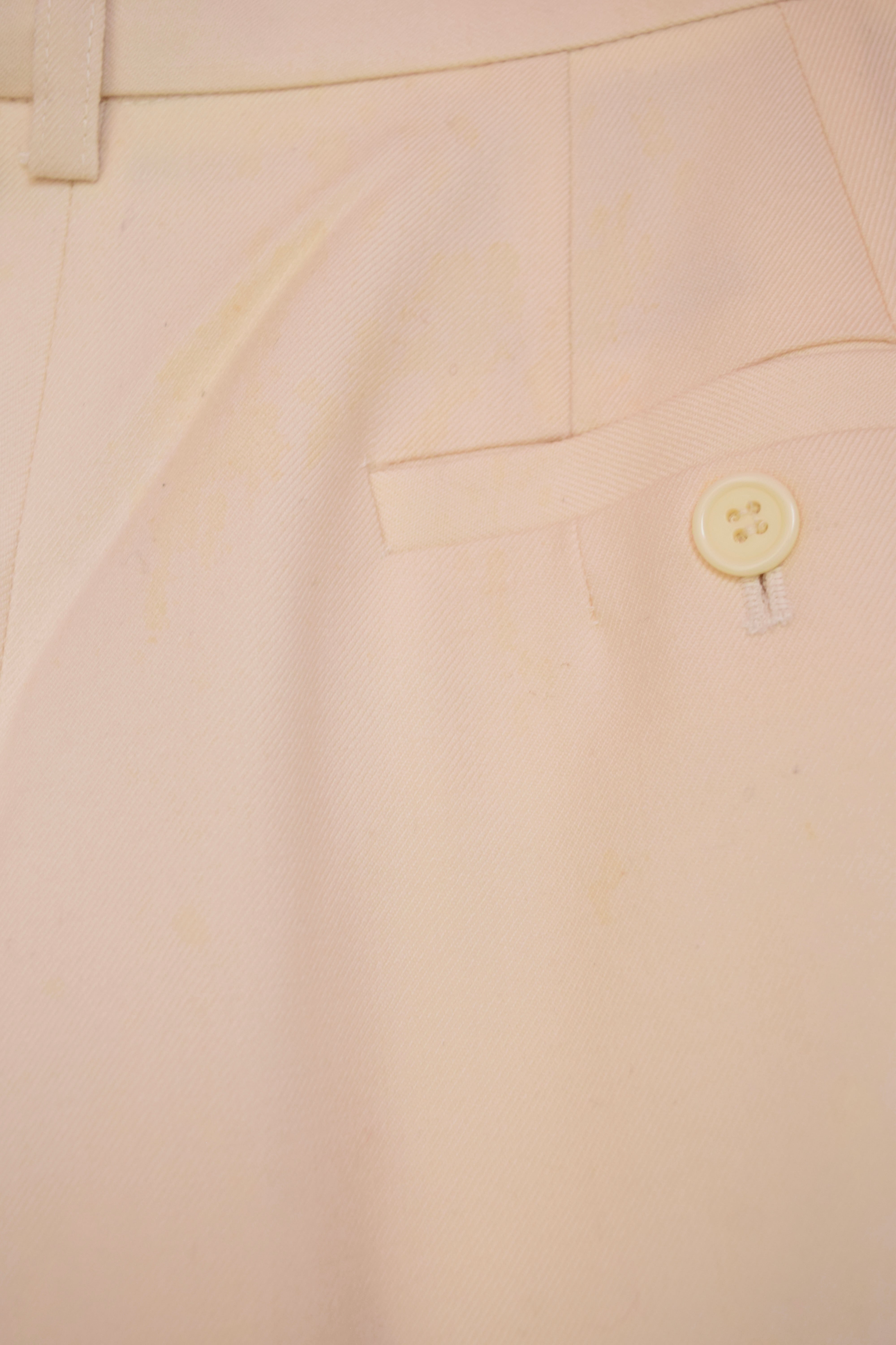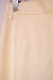 後ろ身頃、ベルトループ付近にシミ。右側は全体的にシミ有り、左側は所々ですがシミ有り。