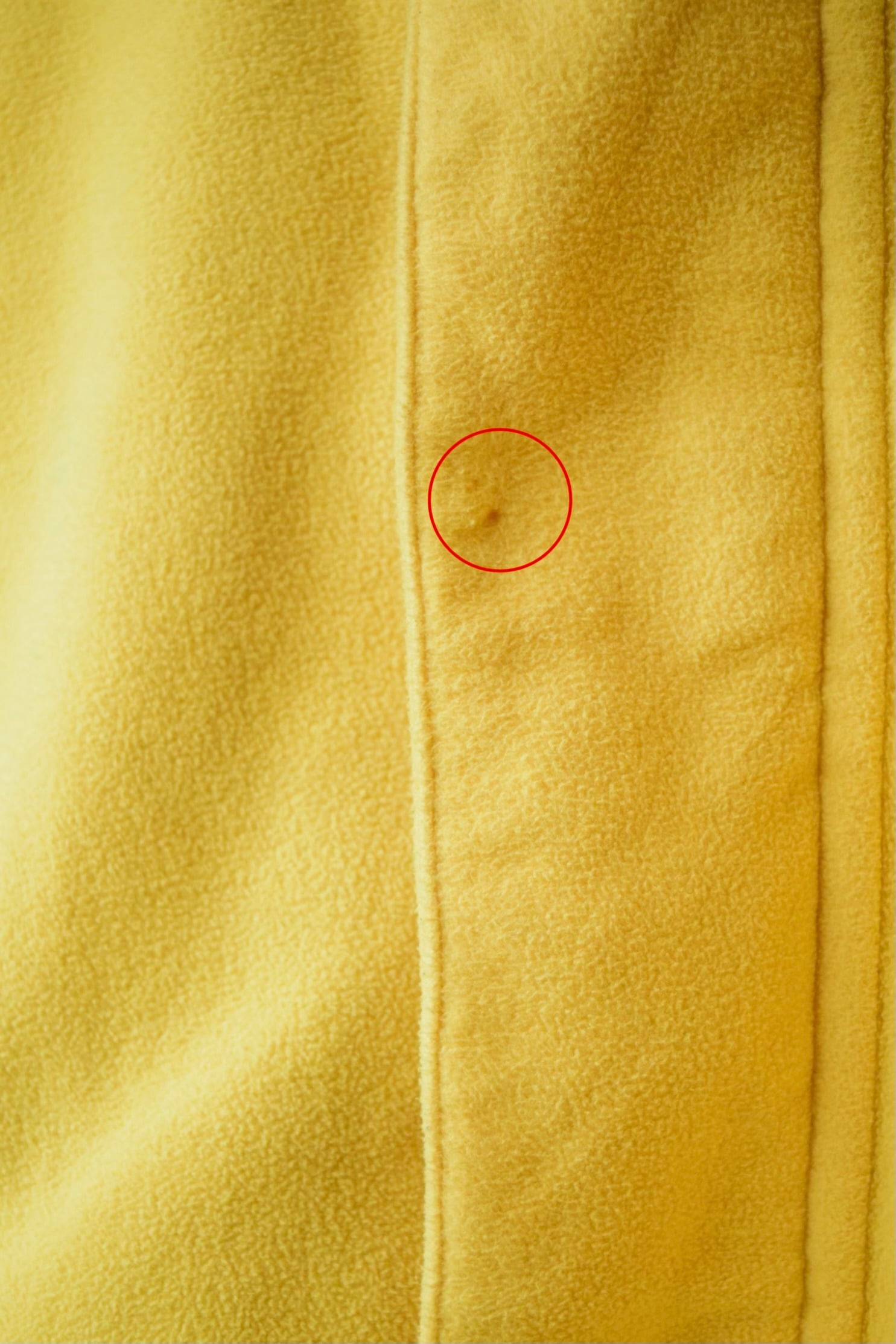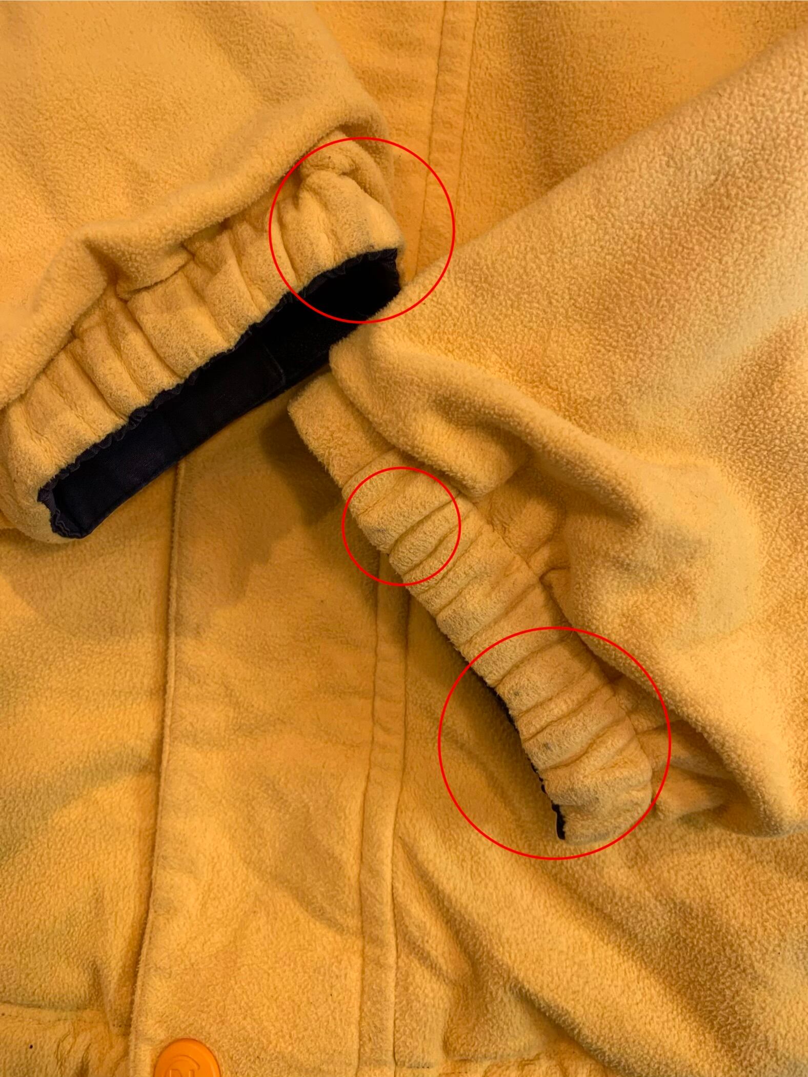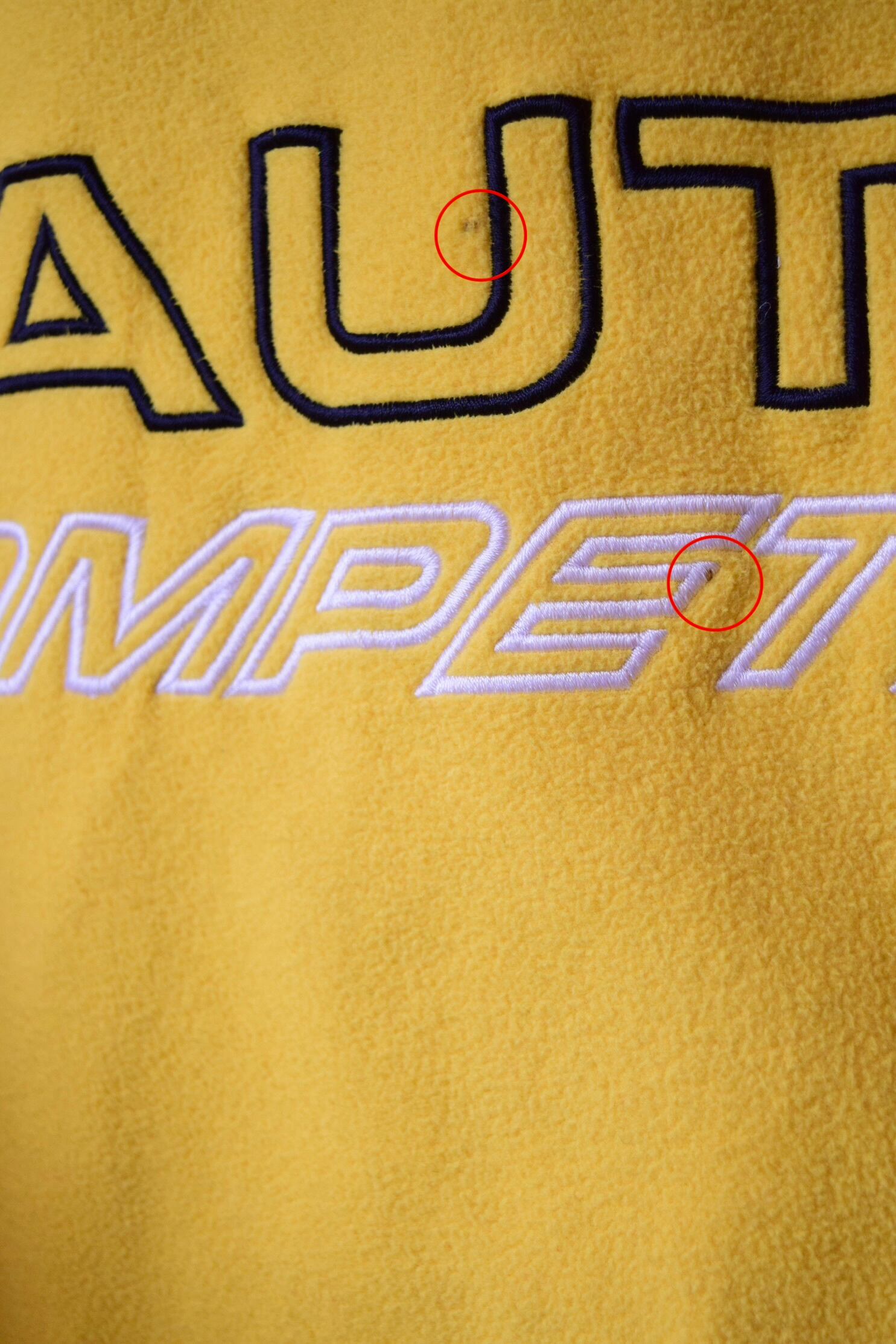フロント中央にダメージ、後ろ身頃の中央に汚れ、両袖の袖口に汚れあり。