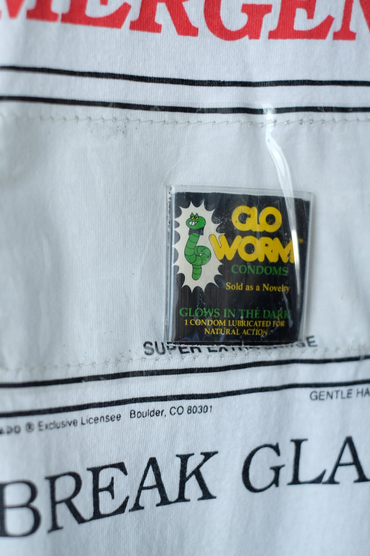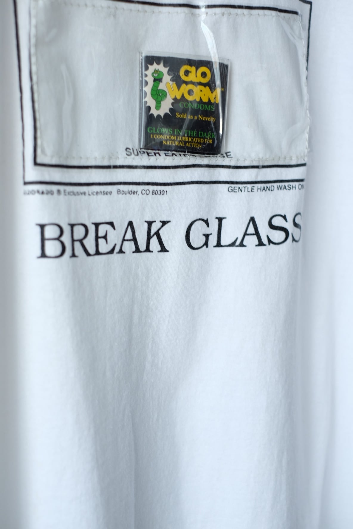 80-90s novelty print tee "IN CASE OF EMERGENCY BREAK GLASS"