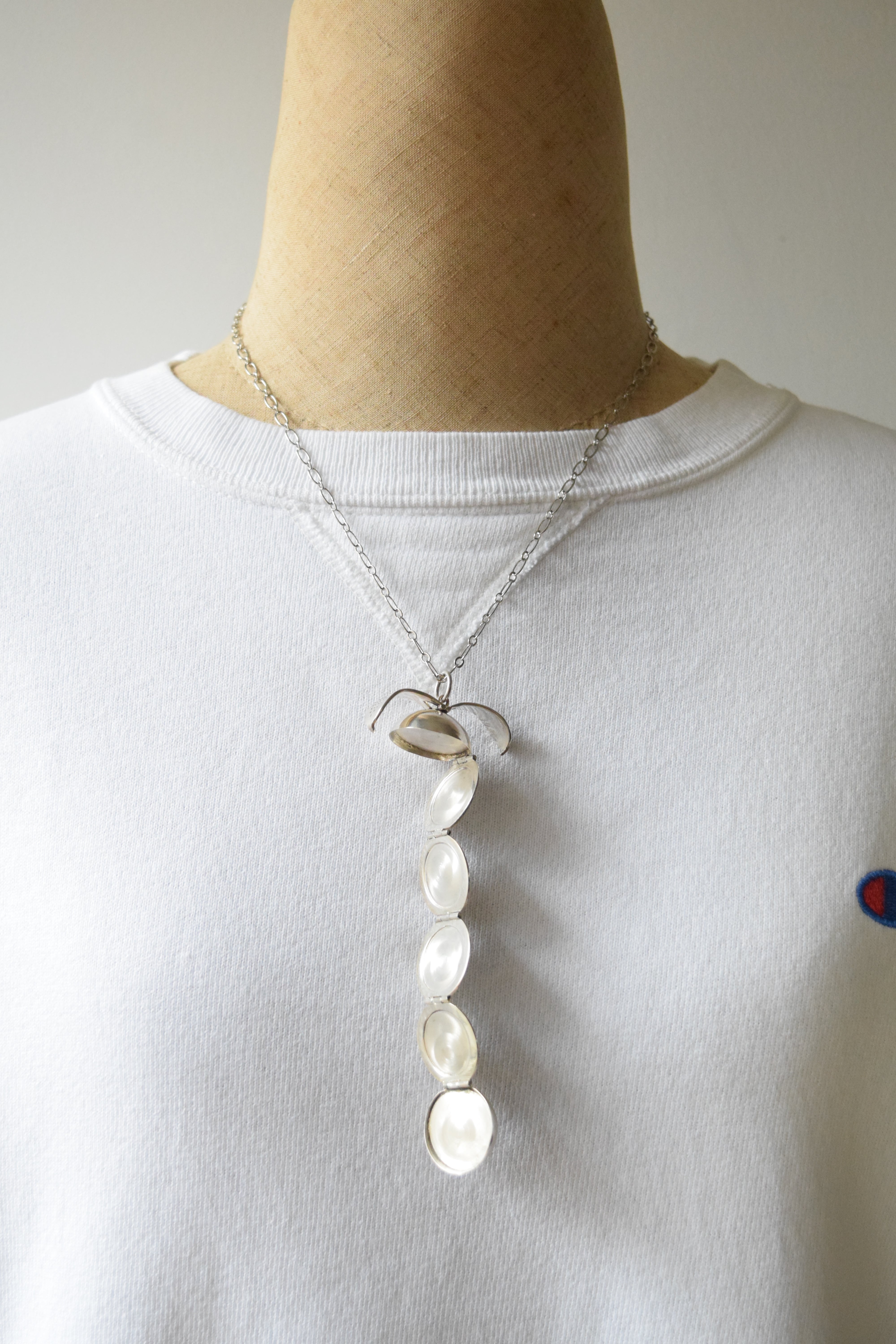ボールを開くと写真を収められるロケットタイプのペンダント。アメリカで買い付けたペンダントトップに、バランスの合いそうな新品のチェーンをおつけしています。